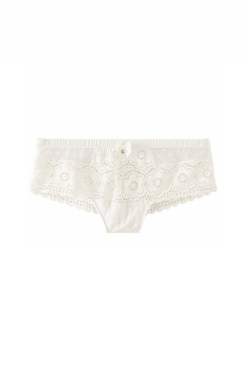 Le shorty AFFINITÉ revisite l’esprit rétro avec élégance grâce à sa dentelle signature ornée de maxi fleurs texturées, emblématique de la ligne inspirée par Brigitte Bardot. Associé à un tulle plumetis délicat, il offre une allure féminine et sophistiquée, tout en conservant une légèreté visuelle irrésistible. La ceinture est sublimée par un nœud fantaisie et un bijou strass mordoré qui apportent une touche glamour subtile, tandis que l’élastique recouvert de satin plissé souligne la silhouette avec finesse.