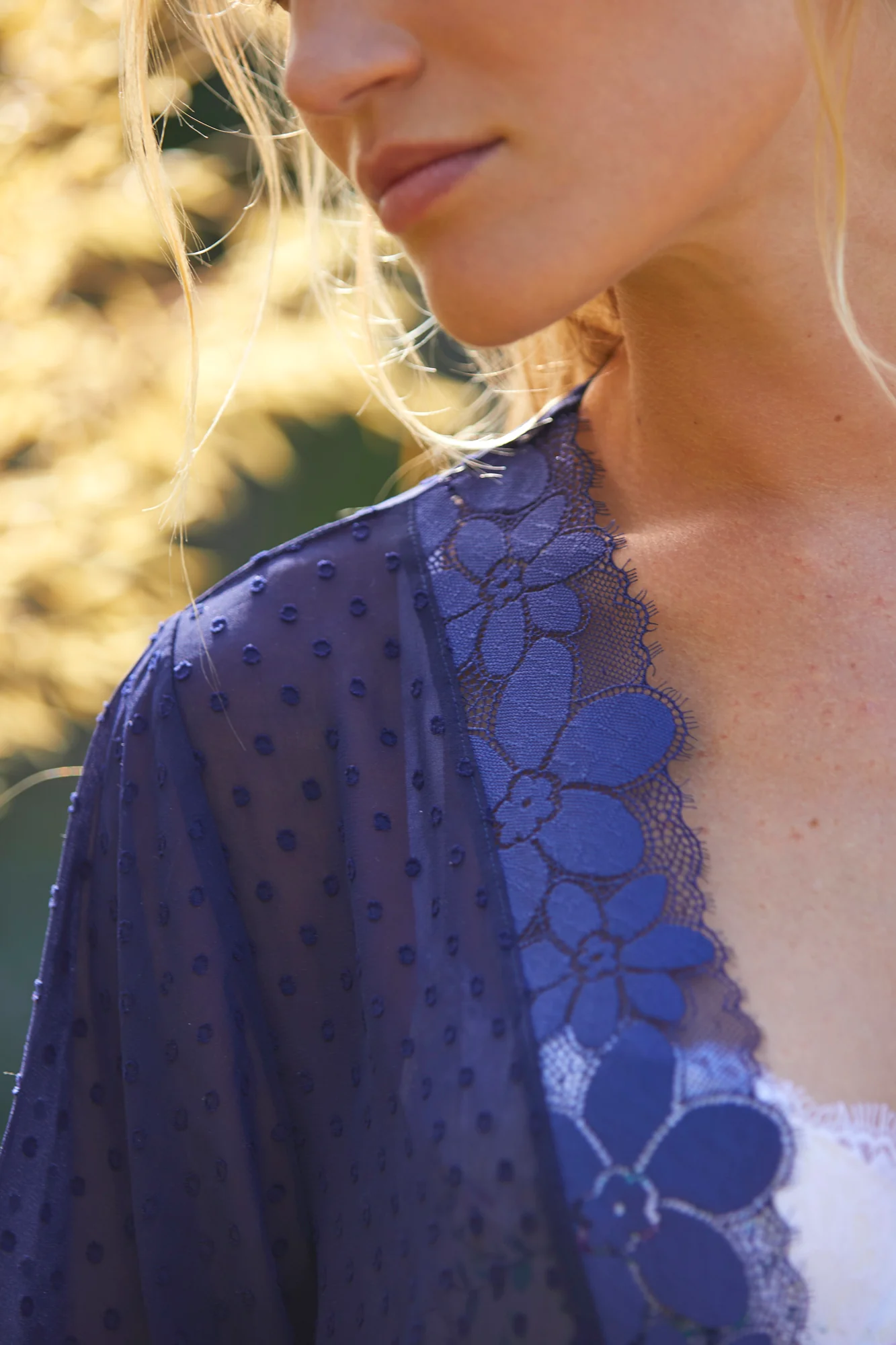 Confectionné dans un tulle délicat à pois et orné d'une bande de dentelle élégante, ce kimono transporte votre imagination vers des époques révolues, où la sensualité était un art à part entière. Le motif "maxi marguerite" à effet de cil ajoute une touche de romance et de féminité, captivant tous les regards.